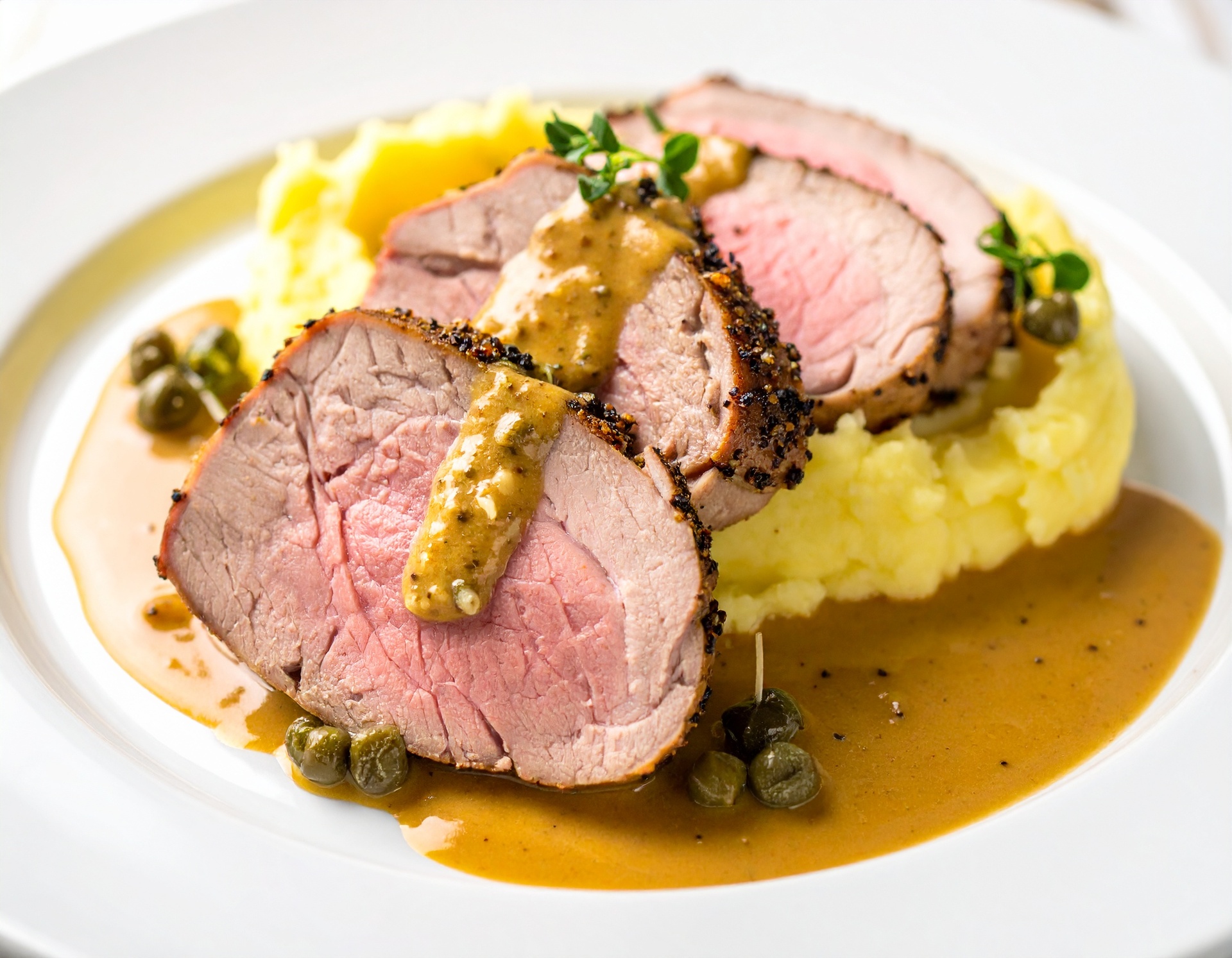 Očistenú bravčovú panenskú v kuse opečieme a vložíme do vyhriatej rúry, alebo konvektomatu na 220°C, kde ju dokončíme na požadovanú prepečenosť.  Po vytiahnutí mäso obalíme v hrubozrnnom korení na steaky a necháme krátko odležať.  Šťavu z pečeného mäsa si pripravíme podľa návodu na obale, pridáme horčicu, kapary a necháme prevariť. Na záver šťavu zjemníme smotanou a parmezánom.