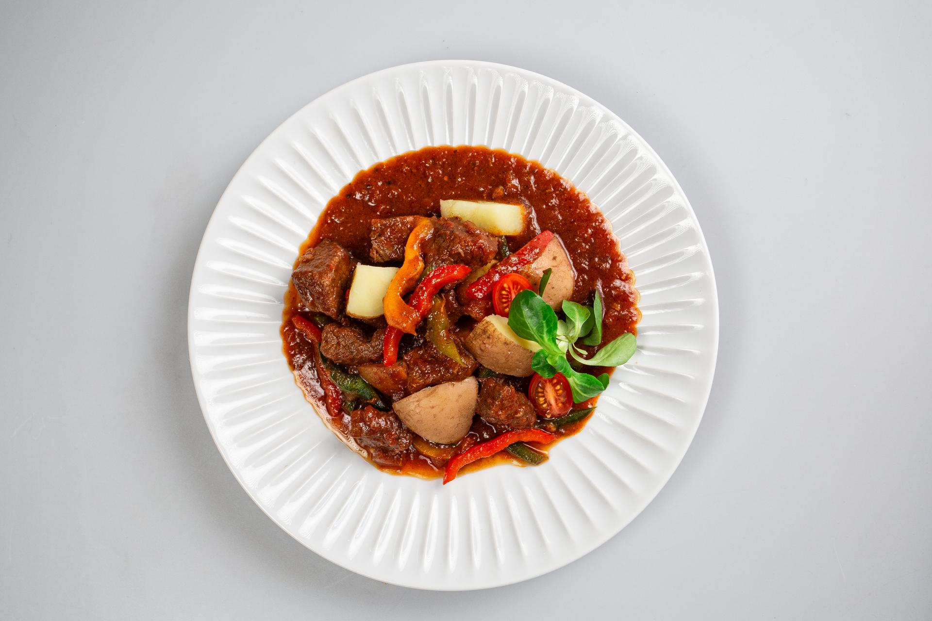 Papriku troch farieb (v zamrazenom stave) rozpečieme v konvektomate cca 3-5 minút pri 180 °C. Akonáhle je mäso mäkké a tekutina zredukovaná do stredne hustej konzistencie (môžeme prihustiť tmavou zápražkou Vitana), pridáme uvarené zemiaky, rozpečenú papriku a krátko spoločne prevaríme. Podľa potreby dochutíme.
