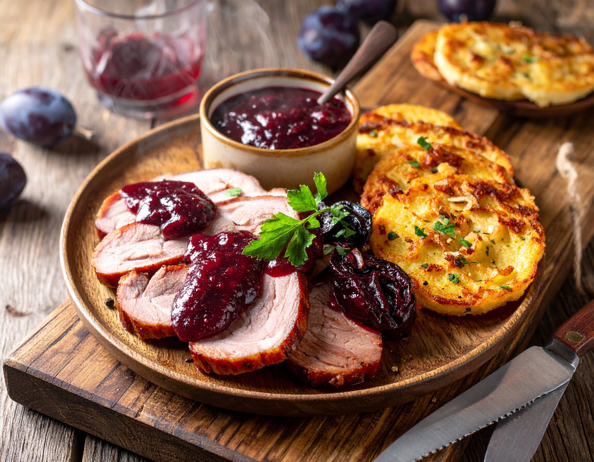 Podávame spoločne s údeným mäsom preliatym slivkovou omáčkou, ozdobíme.