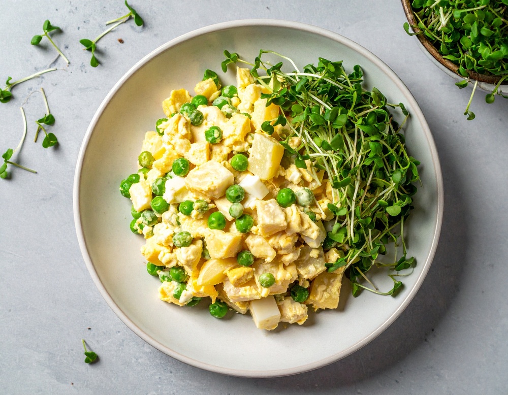 Vajíčkový šalát so zemiakmi a zeleným hráškom, žerucha