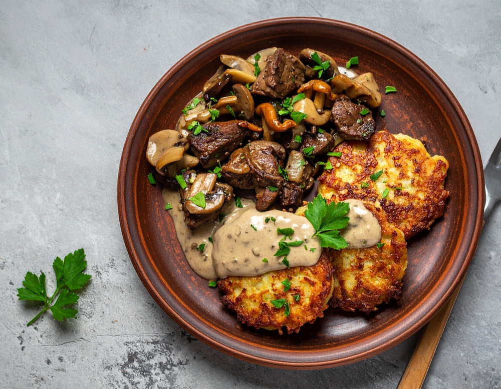 Ďalej prilejeme pripravenú omáčku z kuriatok a šampiňónov podľa návodu, nasekanú petržlenovú vňať a krátko prevaríme. Dochutíme soľou a korením. Podávame so zemiakovými plackami. Posypeme petržlenovou vňaťou.
